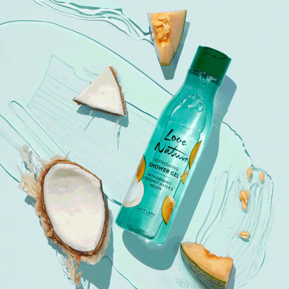 xجل استحمام منعش ومنظف غني بمستخلصات عضوية طبيعية من ماء جوز الهند والبطيخ.