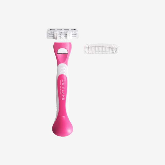 xماكينة حلاقة قابلة لإعادة الاستخدام باللون الوردي الحديث. يتضمن الرأس المحوري شريطًا مرطبًا يحتوي على خلاصة الصبار وفيتامين E لحلاقة أكثر نظافة ونعومة.